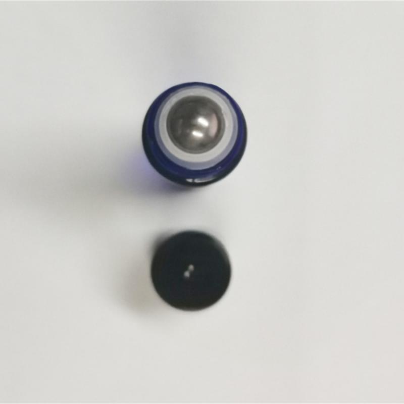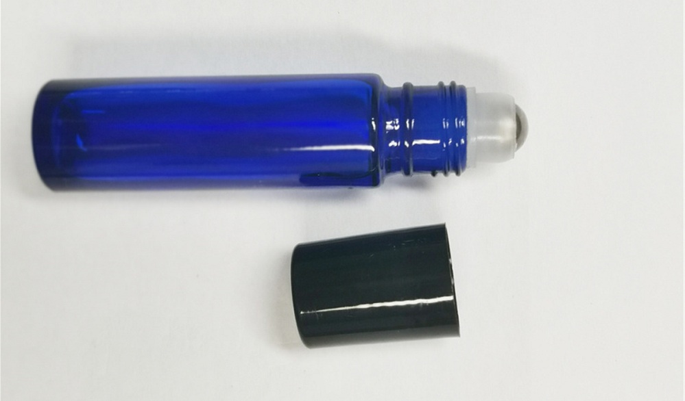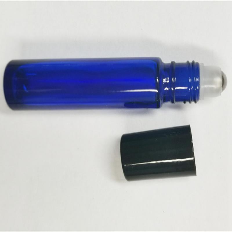 زجاجة أسطوانية زجاجية باللون الأزرق الكوبالتي مع كرة أسطوانية من الفولاذ المقاوم للصدأ وغطاء أسود مثالية للزيوت الأساسية أو زيوت العطور أو السوائل الأخرى.
