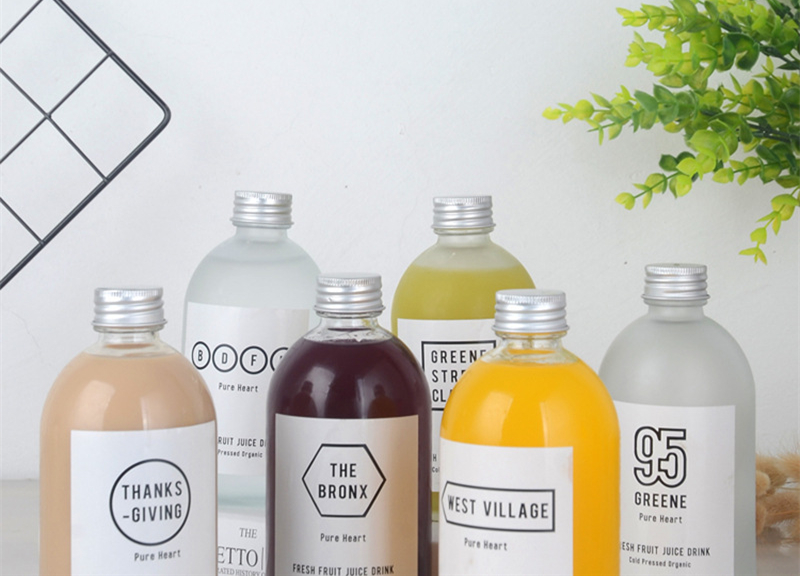 زجاجة مشروب بارد على الطراز الاسكندنافي مع زجاجة قهوة وغطاء من الألومنيوم وزجاجة نبيذ فاكهة وزجاجة شاي حليب بارد.